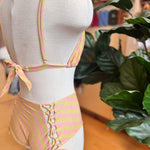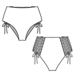 Our most popular bottoms with our signature corsets on the booty. High waisted modest coverage style. She fits true to size and we always recommend a snug fit when dry as fabric relaxes once wet.