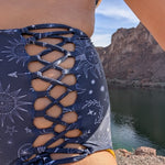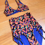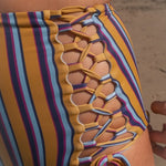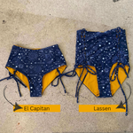 A retro take for us. These bottoms are full coverage and have our signature lace-up corsets on the front sides. They are high rise and above the belly button on most bodies.