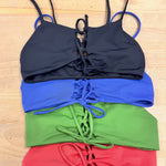 This top has our signature corset lace detail. New, adjustable thin over-the-shoulder straps provide support. This style is similar to a bandeau, yet with the support of thin straps.