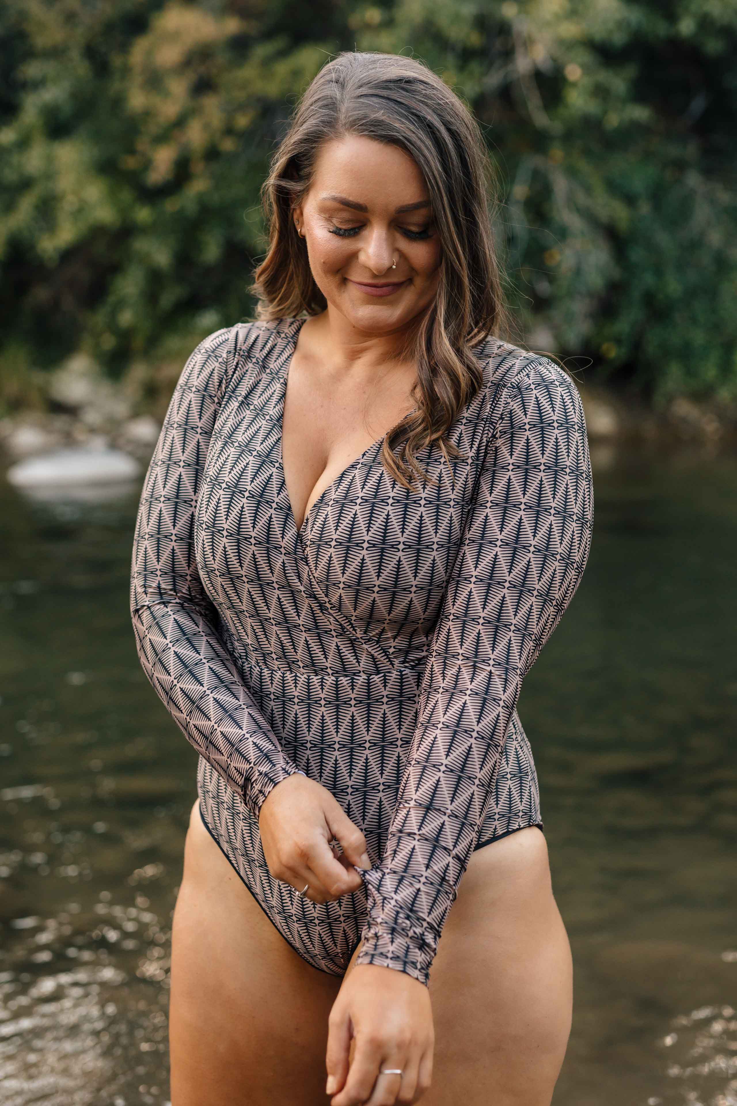 She's back. Our Long Sleeve surf suit and we switched the neck line. Now the V is in the front making this supportive and sexy. She runs snug in a good way, very athletic feeling. Leg openins are slightly higher giving this one piece high hip