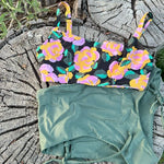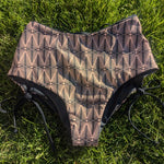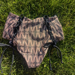 Our most popular bottoms by far with our signature corsets on the booty. High waisted modest coverage style. She fits true to size and we always recommend a snug fit when dry as fabric relaxes once wet.