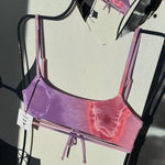 Our thin over-the-shoulder adjustable strap bikini top has a sexy cut-out under boob, and a fun detail bottom strap to play with. This minimal coverage bikini top is fun and flattering!