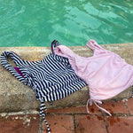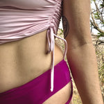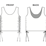 Adjustable length details of side seams giving a ruched look. Thick shoulder straps and above the belly button. Tankini style, perfect for other athletic activities too. Wear front-to-back or back-to -front for more or less coverage on the chest.