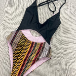 Color blocking and distinct cutout design one piece with micro adjustable shoulder straps and moderate booty coverage. This super sexy one-piece sports a scoop neck and scoop back with high hip leg cut. Runs slightly snug, we do recommend a snug fit when dry, because fabric relaxes once wet.