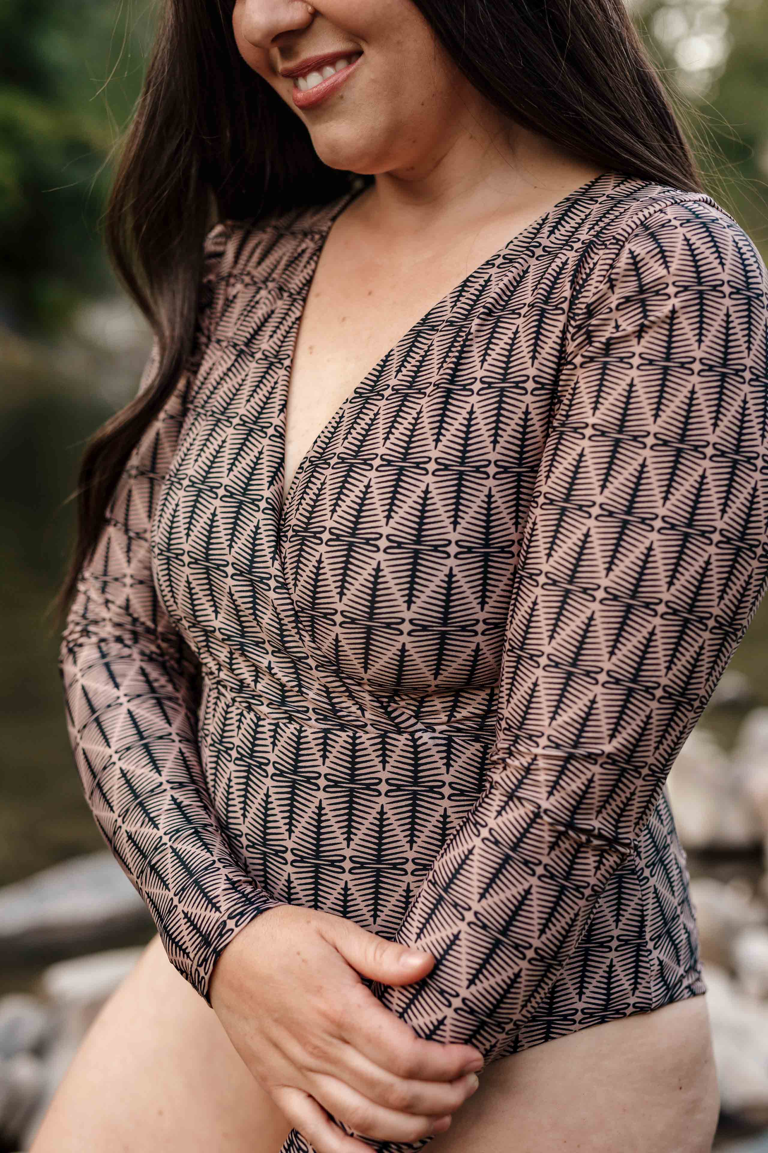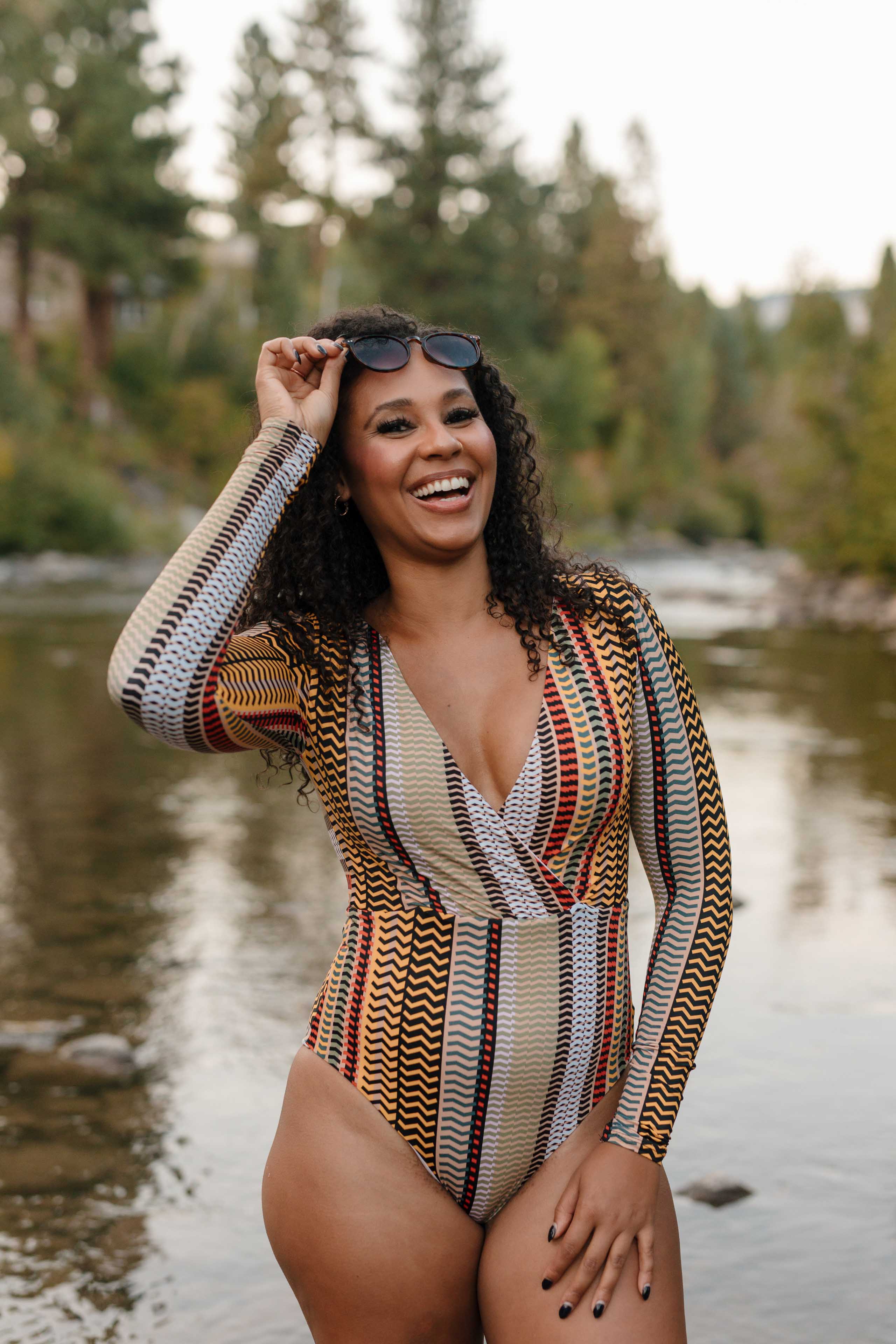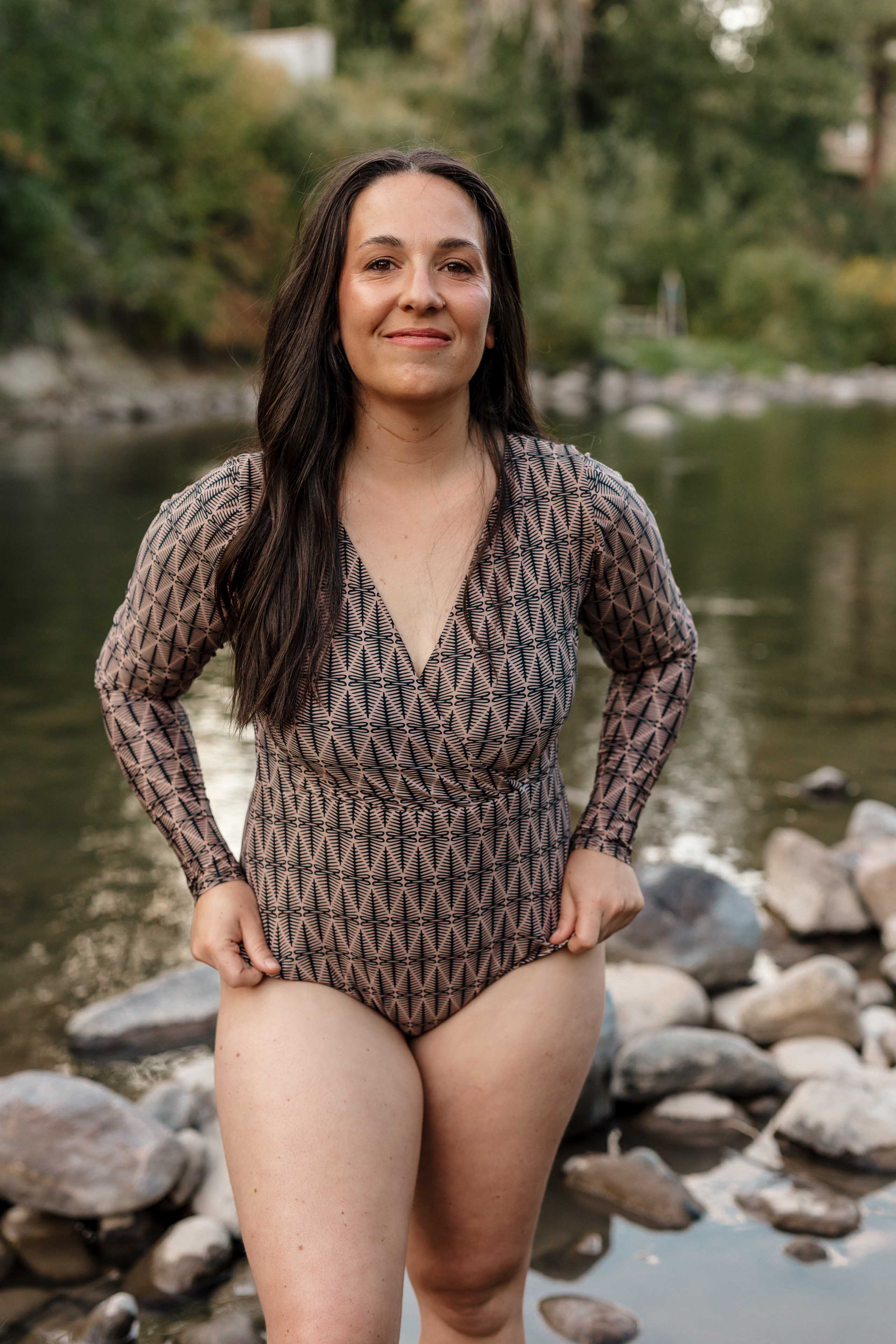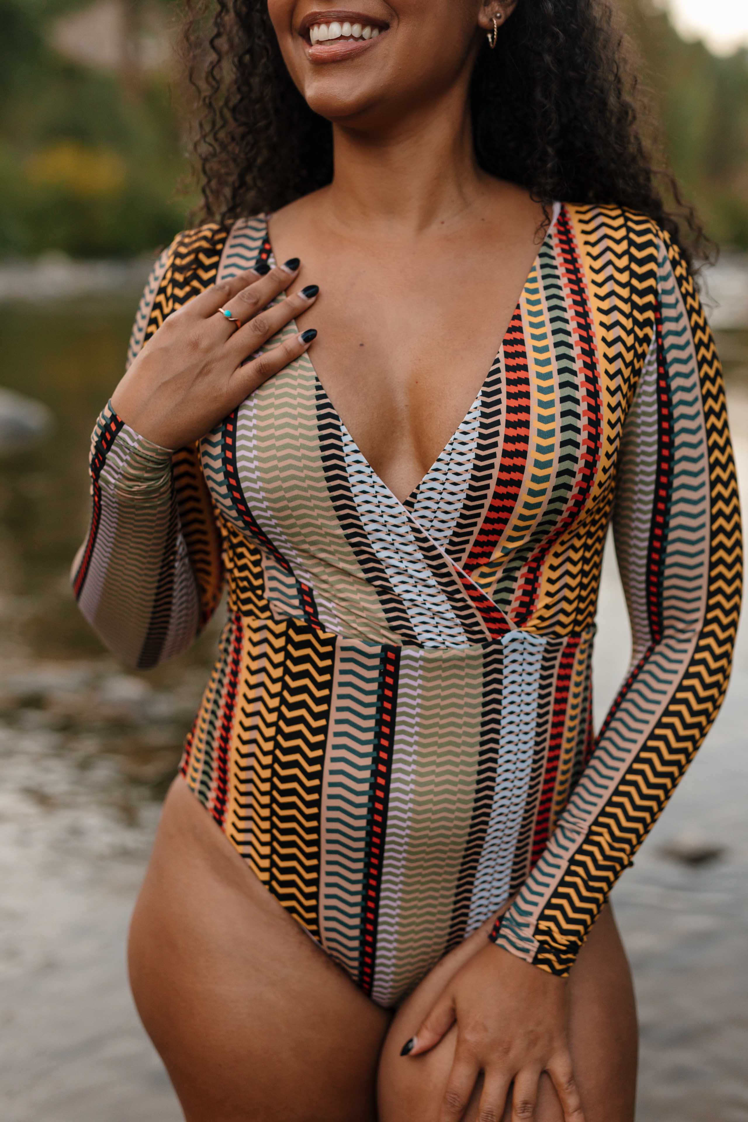 She's back. Our Long Sleeve surf suit and we switched the neck line. Now the V is in the front making this supportive and sexy. She runs snug in a good way, very athletic feeling. Leg openins are slightly higher giving this one piece high hip