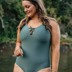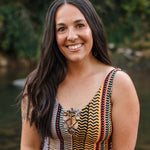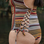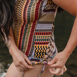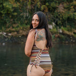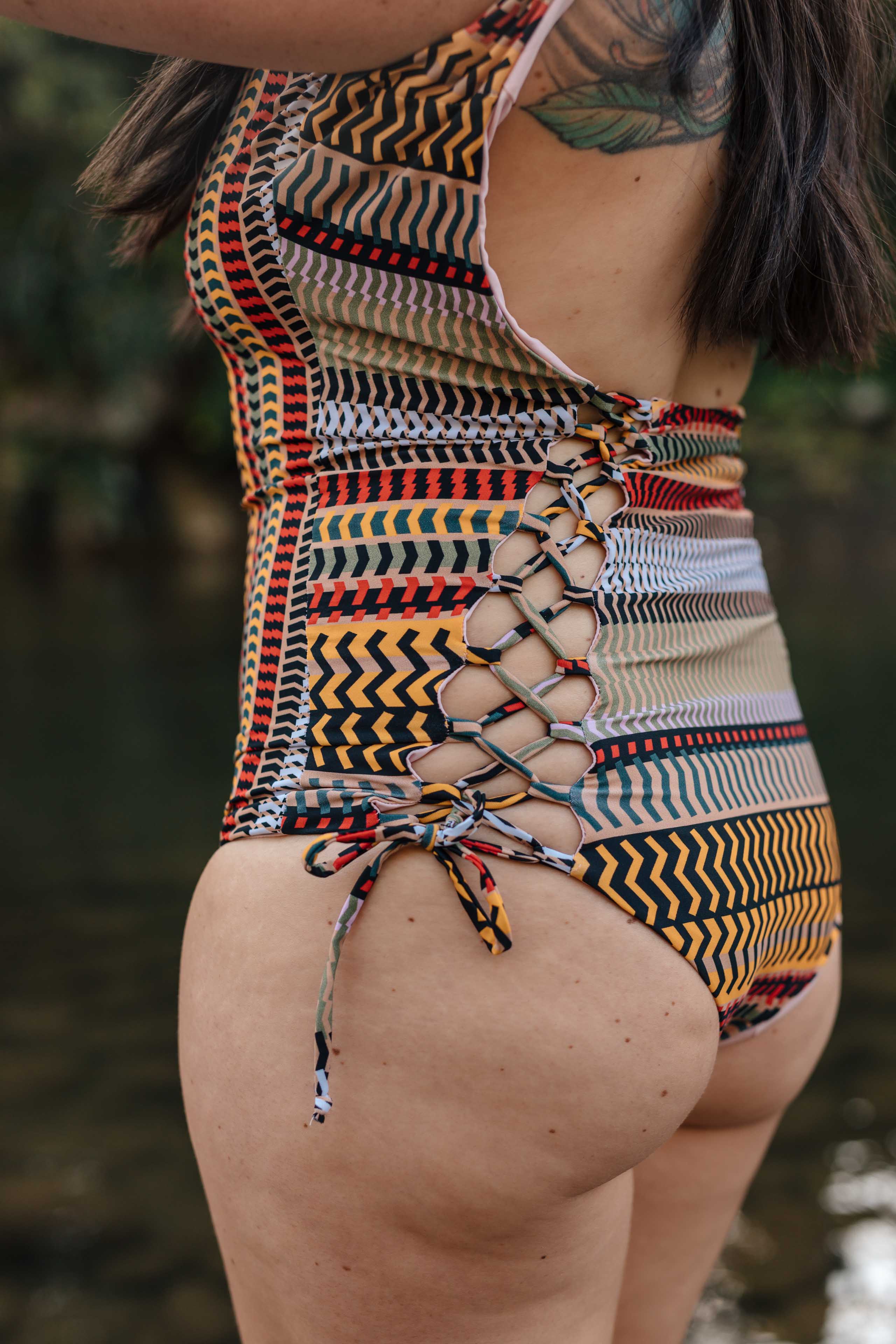 This moderately cheeky one piece swimsuit is our best-selling monokini but with added length in the midsection. Signature corset details down the booty and neckline add sexy details to this bathing suit that are flattering and functional. All print are reversible. True to size, should fit snug when dry, always relaxes once wet.