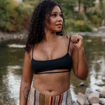 Our thin over-the-shoulder adjustable strap bikini top has a sexy cut-out under boob, and a fun detail bottom strap to play with. This minimal coverage bikini top is fun and flattering!