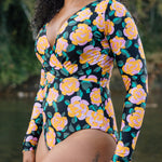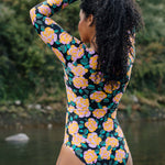 She's back. Our Long Sleeve surf suit and we switched the neck line. Now the V is in the front making this supportive and sexy. She runs snug in a good way, very athletic feeling. Leg openins are slightly higher giving this one piece high hip