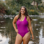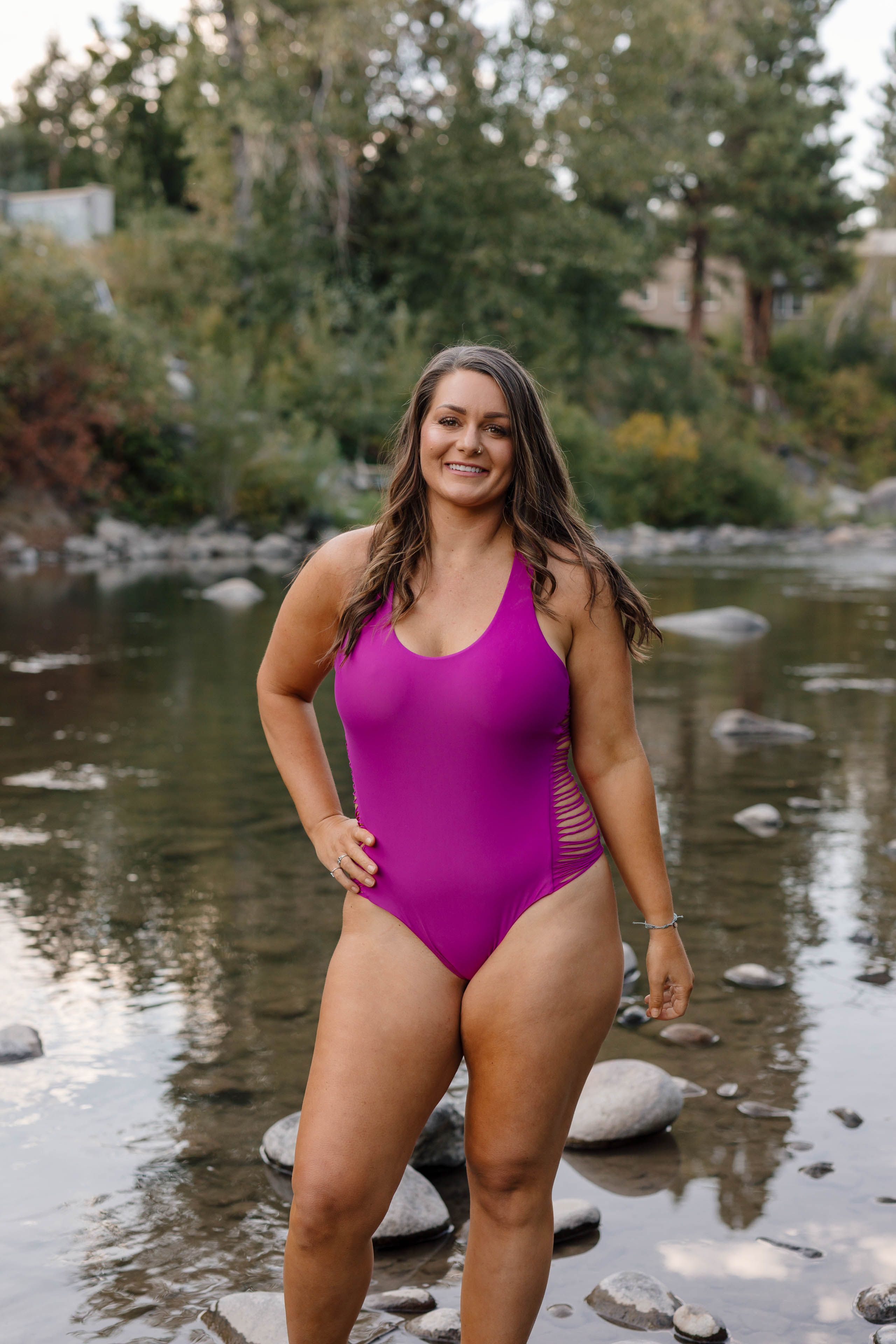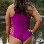 Not your mama's one piece! Moderate cheek coverage, racerback ,one piece. Laser cut details down the sides make her, aka YOU, super sexy. Slits are forgiving as they are super stretchy. This is great for pear and hour glass shape girlies. Want us to size it down to accommodate your shape- email us.