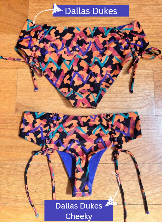 These Dallas dukes are the perfect low rise and medium coverage for me. Can go with anything and are comfortable, easy to wear all day and night. The tajin is a little orangey making it coordinate with the funk town print