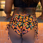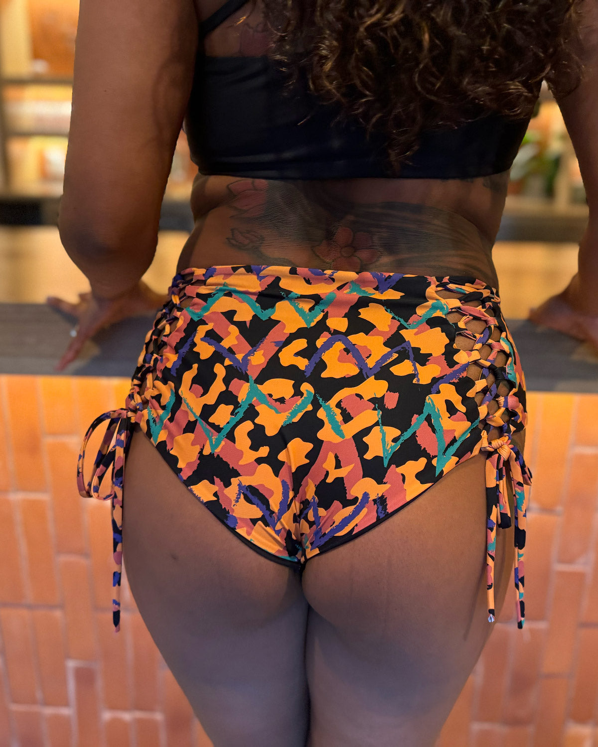 Our most popular bottoms with our signature corsets on the booty. High waisted modest coverage style. She fits true to size and we always recommend a snug fit when dry as fabric relaxes once wet.