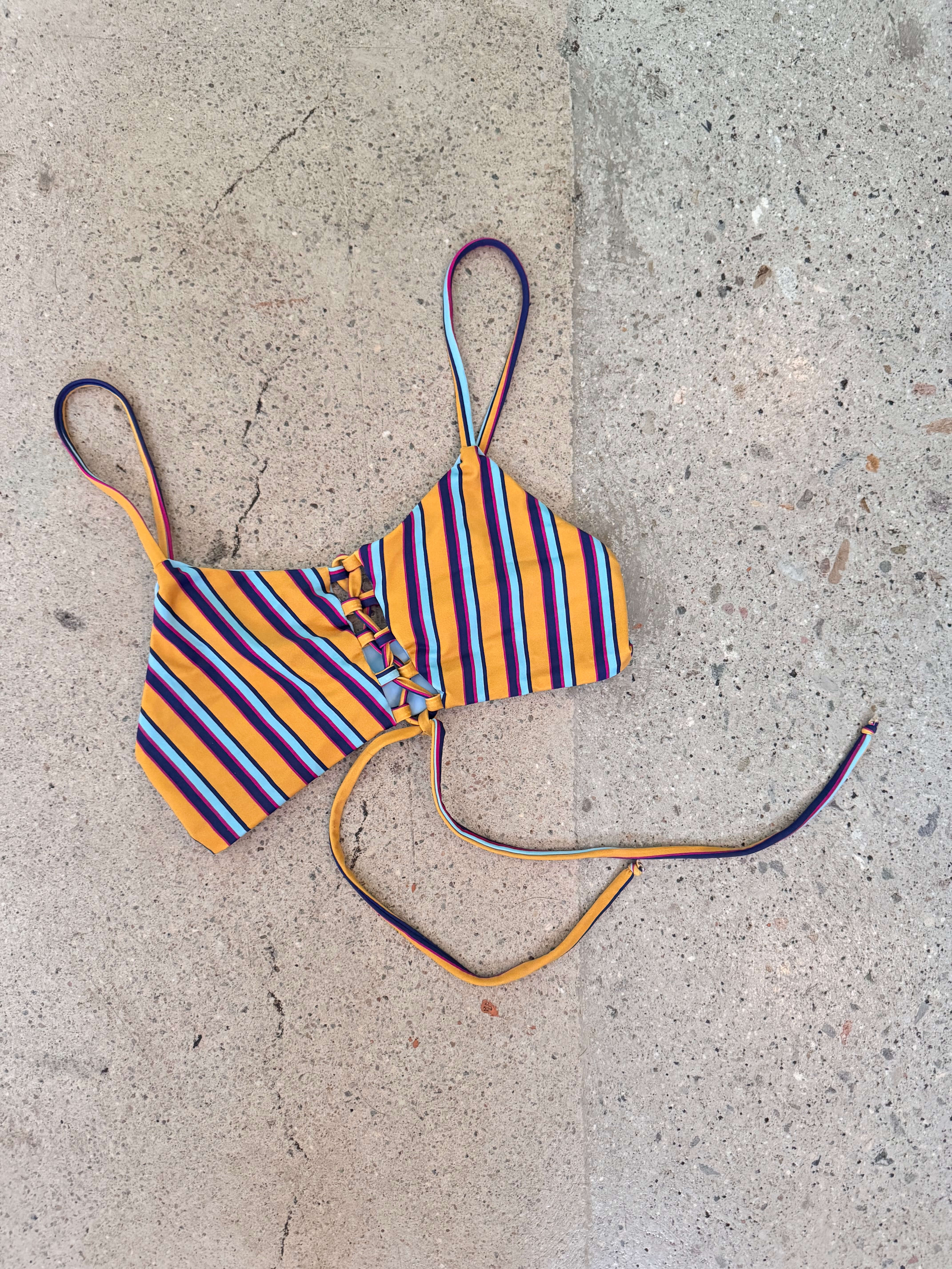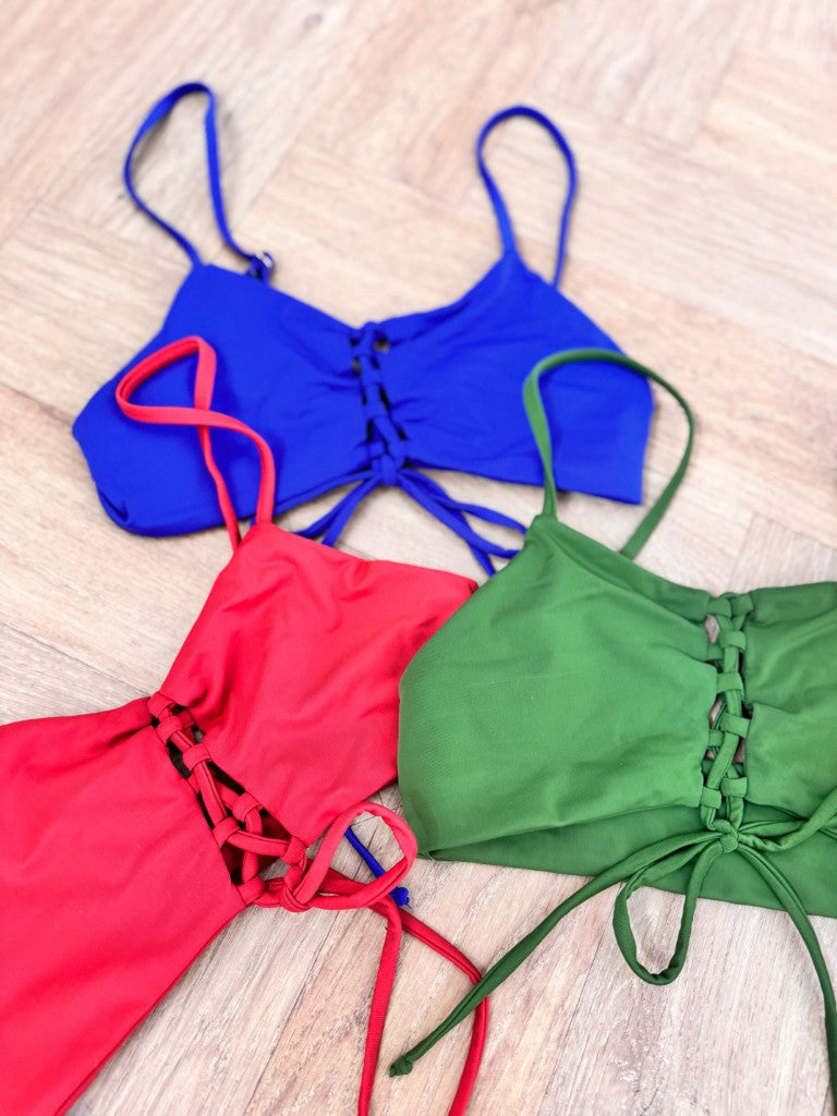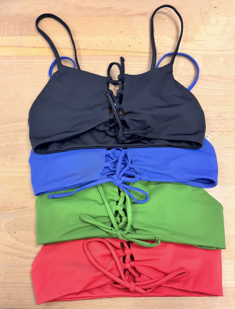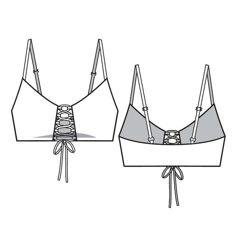 This top has our signature corset lace detail. New, adjustable thin over-the-shoulder straps provide support. This style is similar to a bandeau, yet with the support of thin straps.
