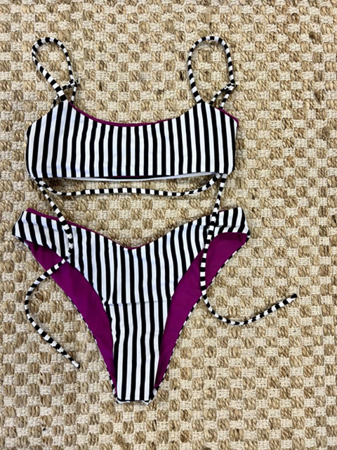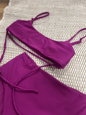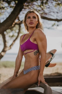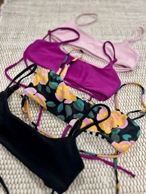 Our thin over-the-shoulder adjustable strap bikini top has a sexy cut-out under boob, and a fun detail bottom strap to play with. This minimal coverage bikini top is fun and flattering!