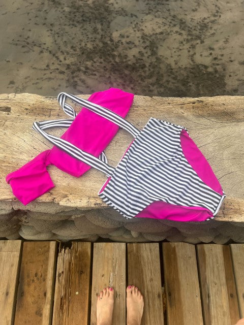 Welcome OVEROOS! Fun new bikini bottoms that have a modest bottom coverage and fun overall straps that criss-cross in the back.
