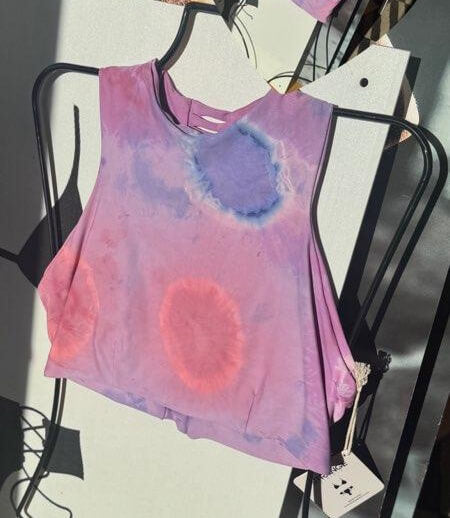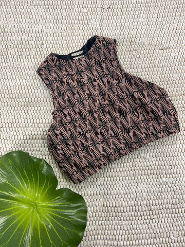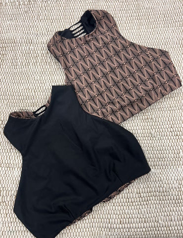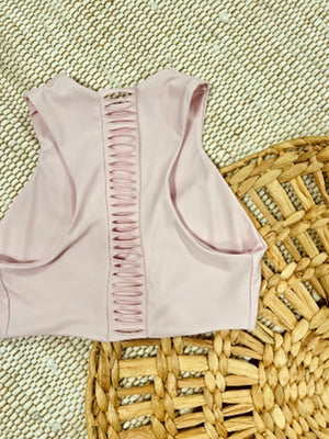 This fun and versatile top makes a comeback. High neck offers max sun protection and great support for full bust and active girlies. Our neck opening is running snug, this is great for active girls, but if you're worried about your big head (we kid) you can leave a note for us to make it wider for ya! Laser cut details down spine make this style a fave and keepin in Strange!