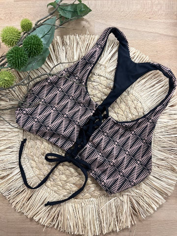 This top has our signature corset lace detail. T-back provides extra support. This style is similar to a bandeau, yet with the support ofa t-back and corset details on the front.