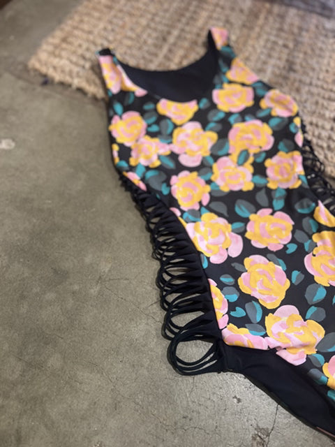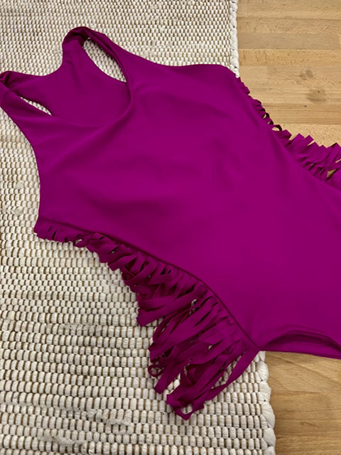 Not your mama's one piece! Moderate cheek coverage, racerback ,one piece. Laser cut details down the sides make her, aka YOU, super sexy. Slits are forgiving as they are super stretchy. This is great for pear and hour glass shape girlies. Want us to size it down to accommodate your shape- email us.