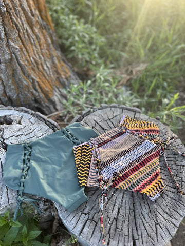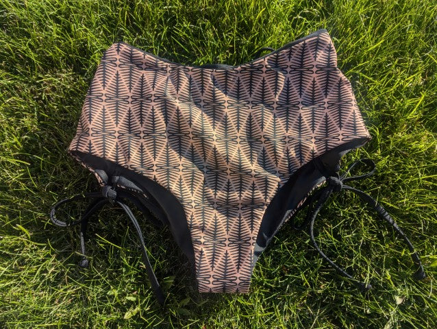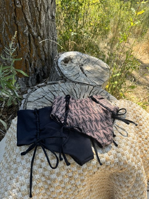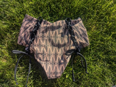 Our most popular bottoms by far with our signature corsets on the booty. High waisted modest coverage style. She fits true to size and we always recommend a snug fit when dry as fabric relaxes once wet.