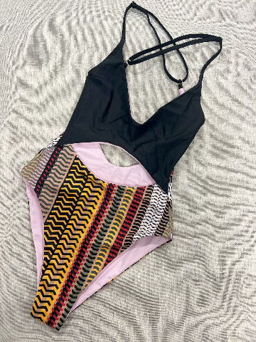 Color blocking and distinct cutout design one piece with micro adjustable shoulder straps and moderate booty coverage. This super sexy one-piece sports a scoop neck and scoop back with high hip leg cut. Runs slightly snug, we do recommend a snug fit when dry, because fabric relaxes once wet.