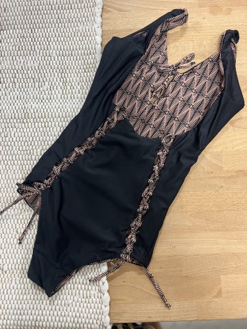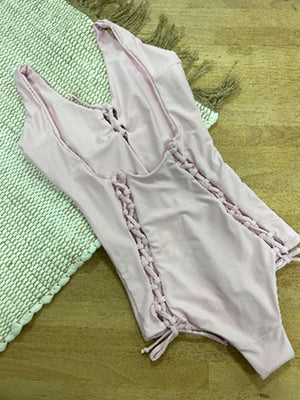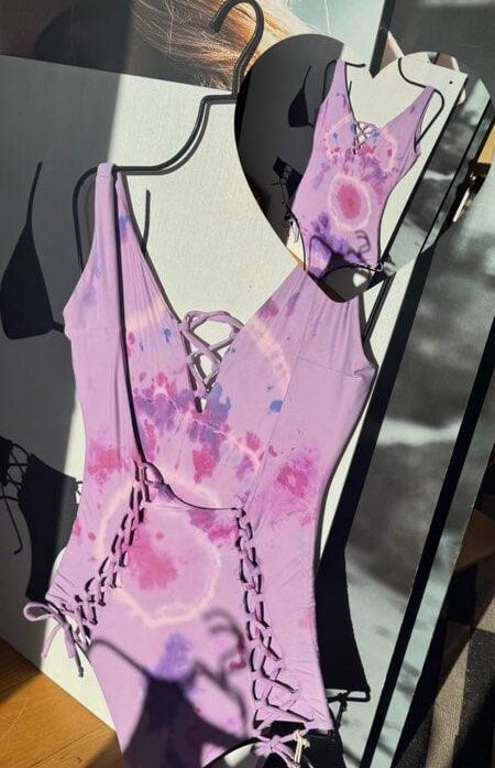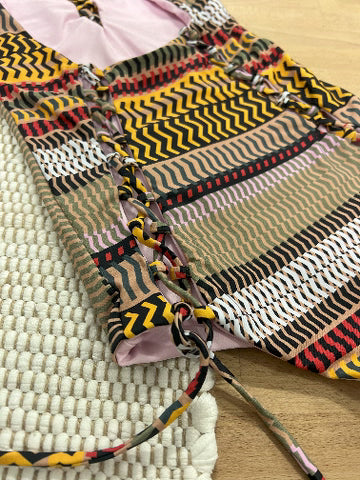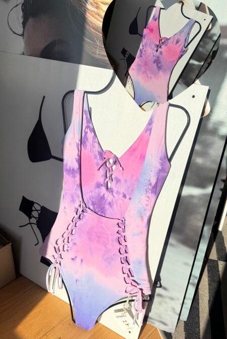 This moderately cheeky one piece swimsuit is our best-selling monokini but with added length in the midsection. Signature corset details down the booty and neckline add sexy details to this bathing suit that are flattering and functional. All print are reversible. True to size, should fit snug when dry, always relaxes once wet.