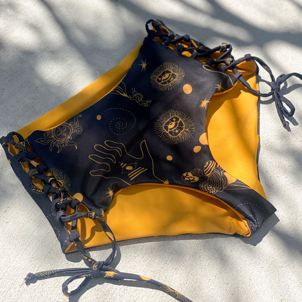 Our most popular bottoms with our signature corsets on the booty. High waisted modest coverage style.