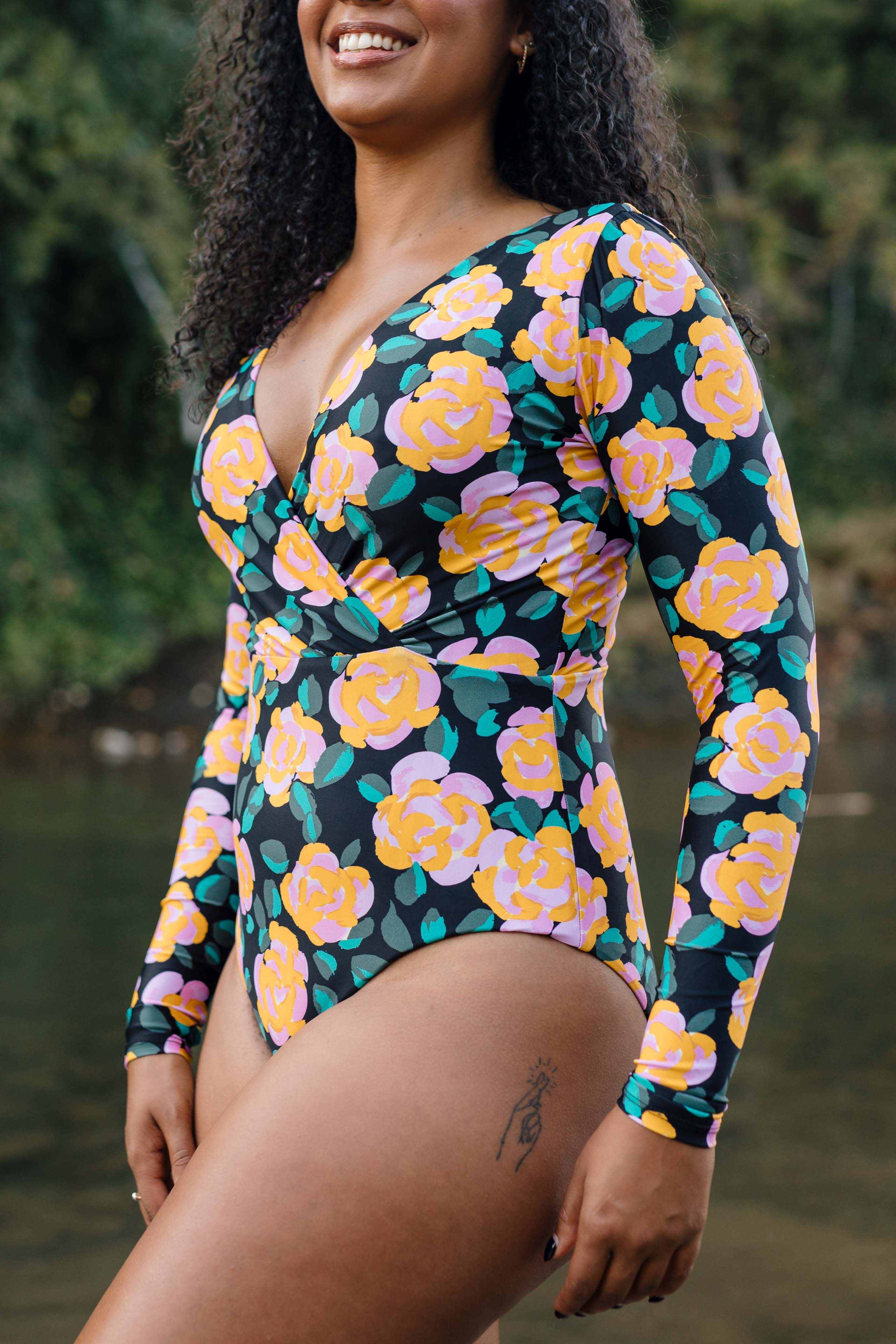 She's back. Our Long Sleeve surf suit and we switched the neck line. Now the V is in the front making this supportive and sexy. She runs snug in a good way, very athletic feeling. Leg openins are slightly higher giving this one piece high hip