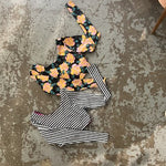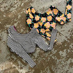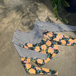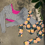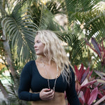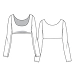 This piece features a simple scoop neck in front. Flip it and you’ve got a high neckline and sexy scoop back! The long sleeves serve as great sun protection. Multi-wear babe!
