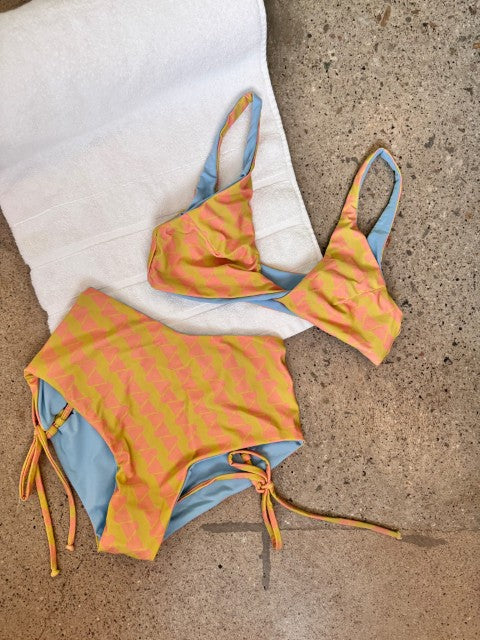 Obsessed with the print and style! The fabric is so soft and the fit is very flattering. It covers enough belly to make me feel comfortable, but still cheeky. This was my first purchase in taffy stripe paired with the verdi twist top. I fell in love with the fabric and quality that I bought another suit I was eyeing same day after getting this delivered and trying on.