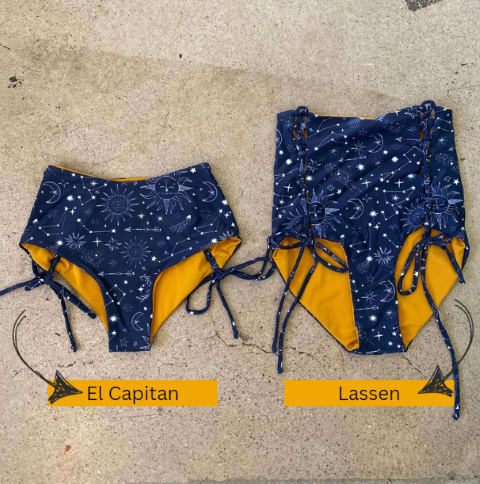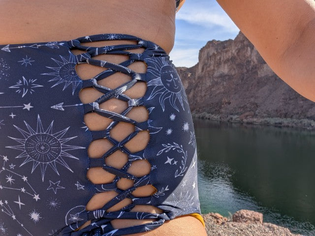 A retro take for us. These bottoms are full coverage and have our signature lace-up corsets on the front sides. They are high rise and above the belly button on most bodies.