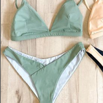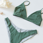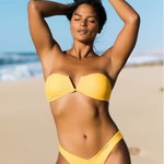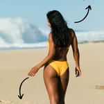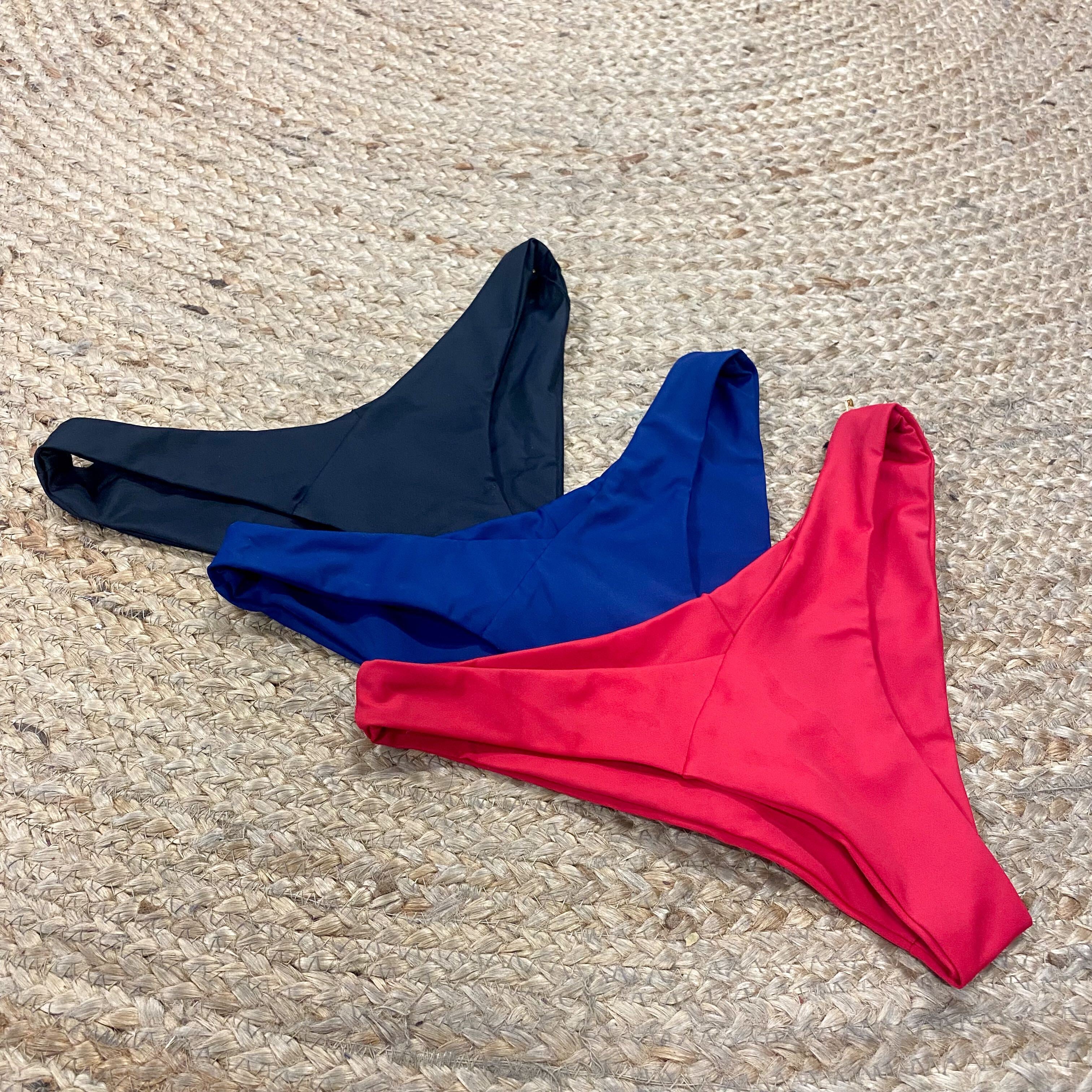 Medium coverage bottoms with a semi high hip cut. The low rise in front gives a V shape. Minimal bum coverage, but slightly more coverage than the Super Cheeky version.